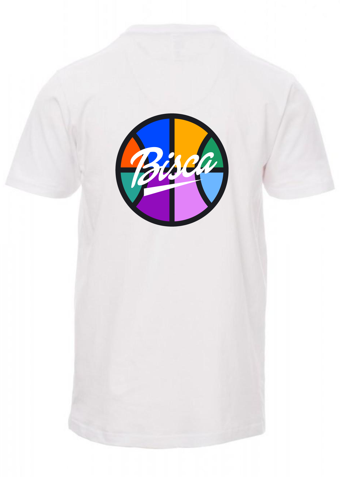 T-shirt blanc, encolure ras le cou et manches courtes, col en bord côtes mixte spandex de 1,5 cm avec couture rabattue sur le devant, ruban de renfort d’épaule à épaule dans couleur en contraste sur le col, coutures stretch, couture latérale. Logo édition spéciale au coeur et au dos.
